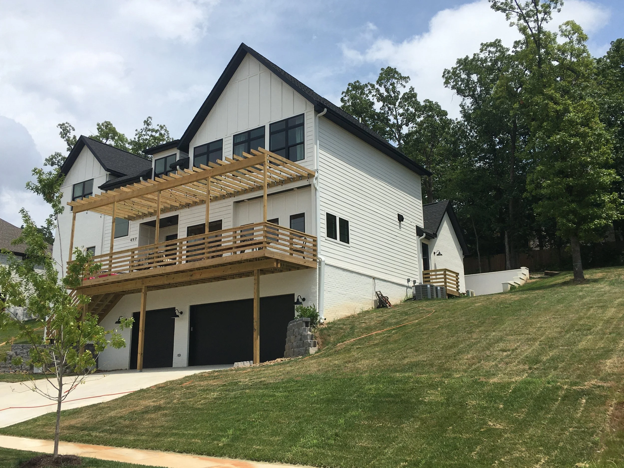 This Modern Farmhouse project in Northwest Arkansas and the challenge of building it on a steep site highlights the importance of working with an architect who has experience with slopes. These clients worked with a local draftsman who designed their home $130,000 over budget in 2017 leading them to look for a better alternative. In working with Matisse Studios, we redesigned their home and were able to shave off 300 square feet, making the design more compact and therefore more affordable to build on the hillside. The clients ended up getting more than what they wanted and within budget. They said, “Every inch of the space is efficiently designed and utilized.” We also enjoyed working with the builders on this project, GB Group Construction.